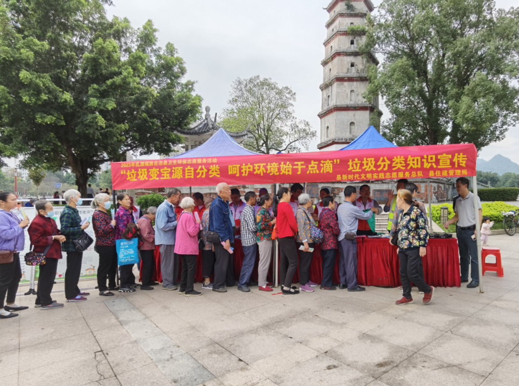 为带动更多市民养成分类投放的好习惯,携手创建文明城市,做文明市民,10月18日上午,县新时代文明实践志愿服务总队、县住建管理局在县文昌公园开展2023年乳源瑶族自治县卫生环保志愿服务活动之“垃圾变宝源自分类 呵护环境始于点滴”垃圾分类知识宣传活动。