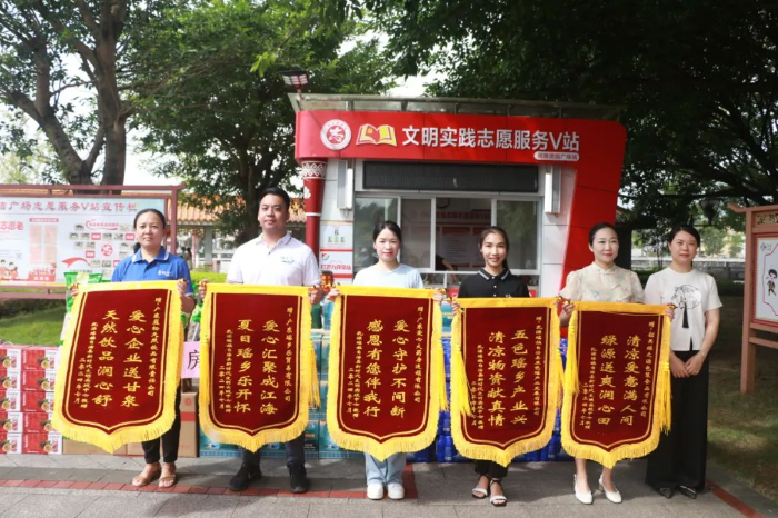 7月19日,县新时代文明实践中心在县民族团结广场组织举行“爱心企业夏日送清凉”捐赠仪式,多家爱心企业在仪式上慷慨奉献出自己的爱心,在炎炎夏日中为我县的户外工作者送上一丝清凉和一份关爱。 捐赠仪式上,广东蓝松天然饮品有限责任公司、广东瑶乡乐贸易有限公司、广东爱心大药房连锁有限公司、乳源瑶族自治县五色瑶产业发展有限公司以及韶关绿之源包装食品有限公司等企业将满载着爱心与关怀的物资现场捐献给县新时代文明实践中心;县委宣传部相关负责人为爱心企业颁发荣誉锦旗。据新时代文明实践中心相关负责人介绍,本次捐赠的物资将分发至全县各个志愿服务V站,并根据户外工作者们的实际需要。免费提供给户外工作者们。
