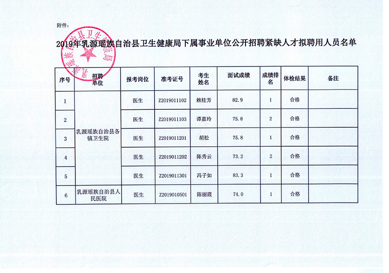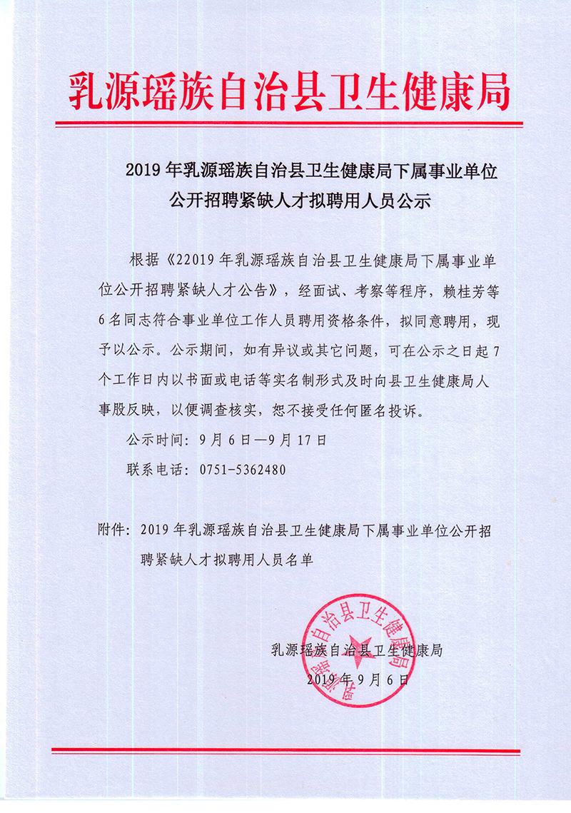2019年乳源瑶族自治县卫生健康局下属事业单位公开招聘紧缺人才拟聘用人员公示