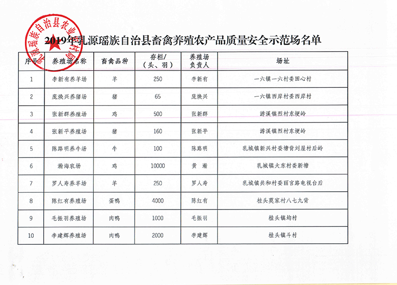 关于2019年乳源瑶族自治县畜禽养殖农产品质量安全示范场名单的公示