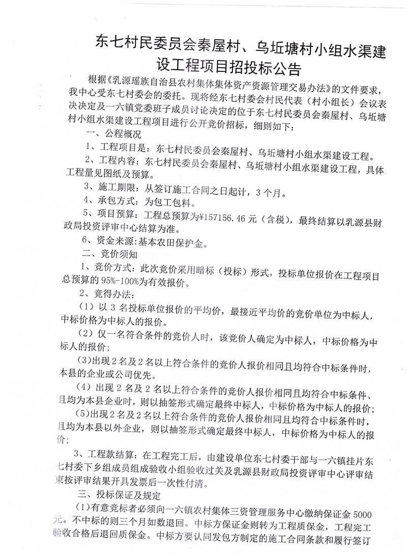 东七村民委员会秦屋村、乌坵塘村小组水渠建设工程项目招投标公告