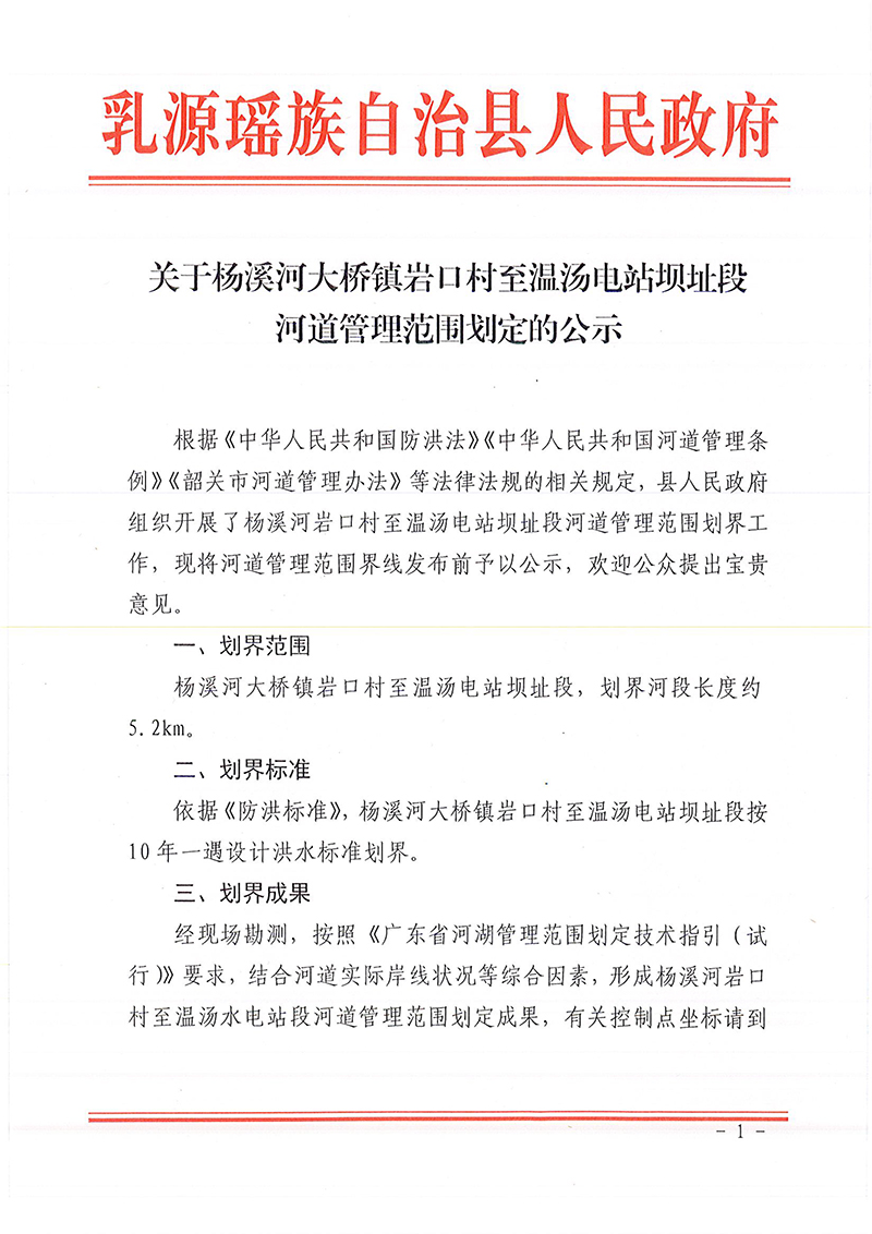 关于杨溪河大桥镇岩口村至温汤电站坝址段河道管理范围划定的公示