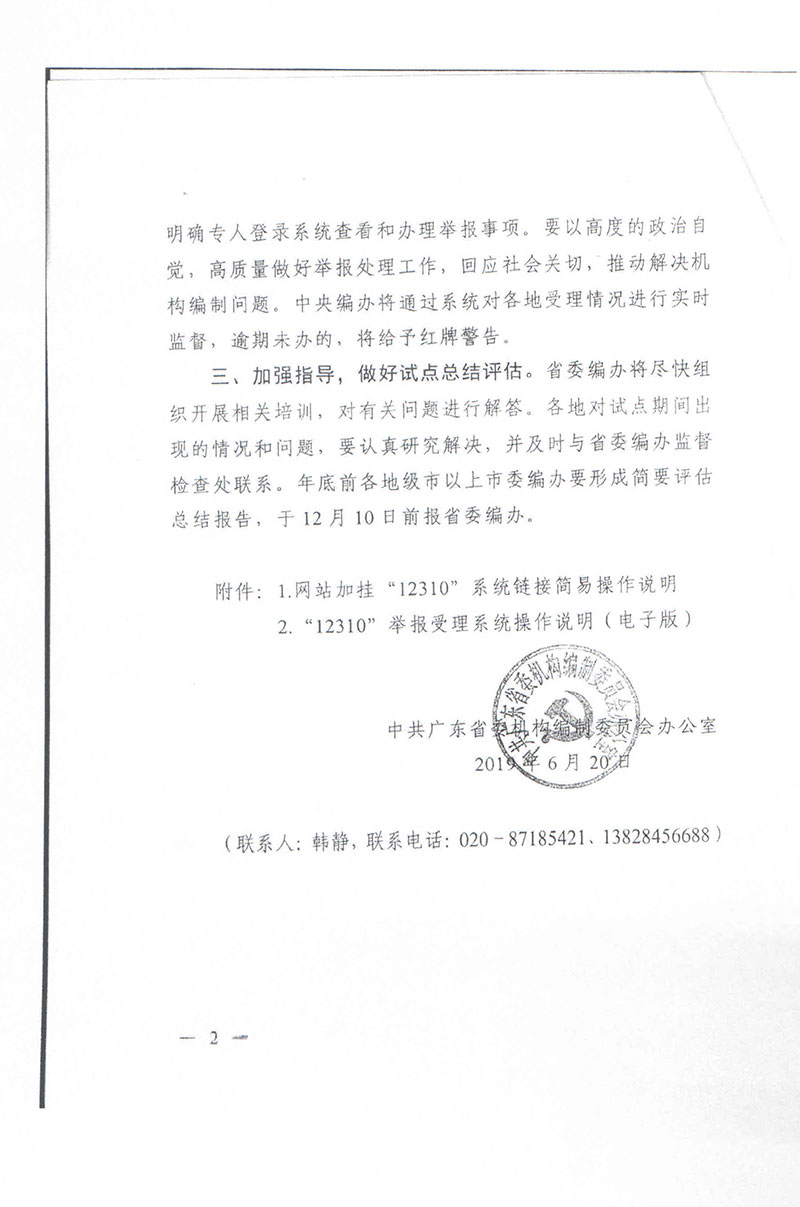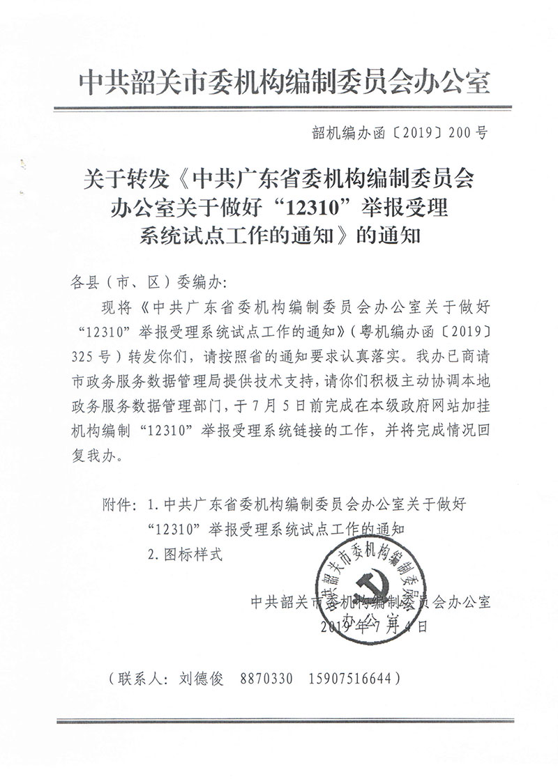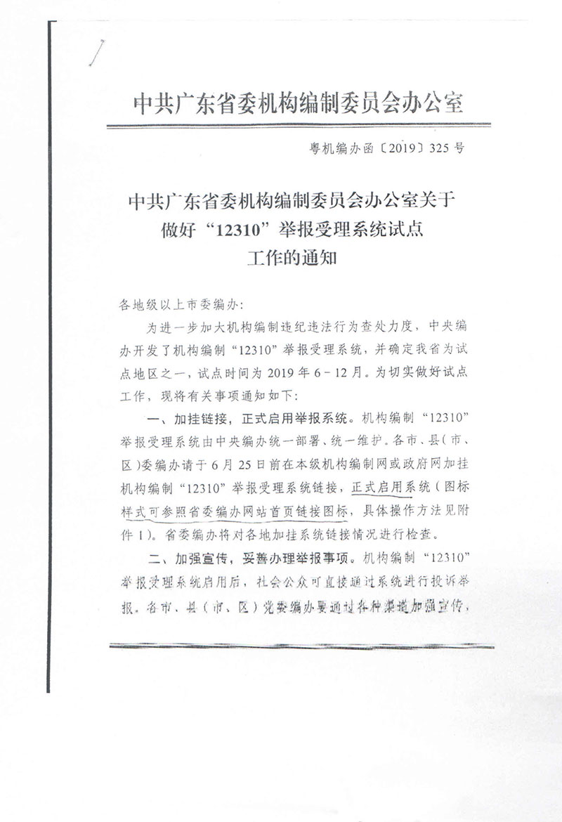 关于转发《中共广东省委机构编制委员会办公室关于做好“12310”举报受理系统试点工作的通知》的通知
