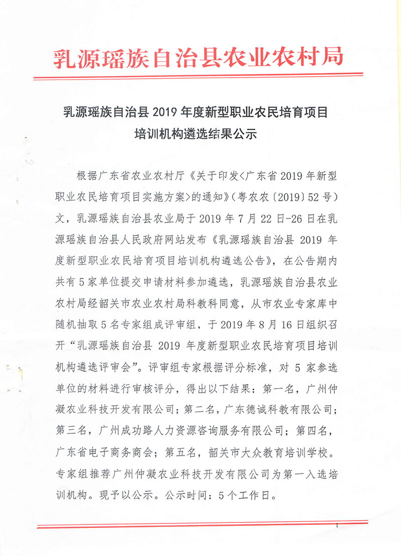 乳源瑶族自治县2019年度新型职业农民培训项目培训机构遴选结果公示