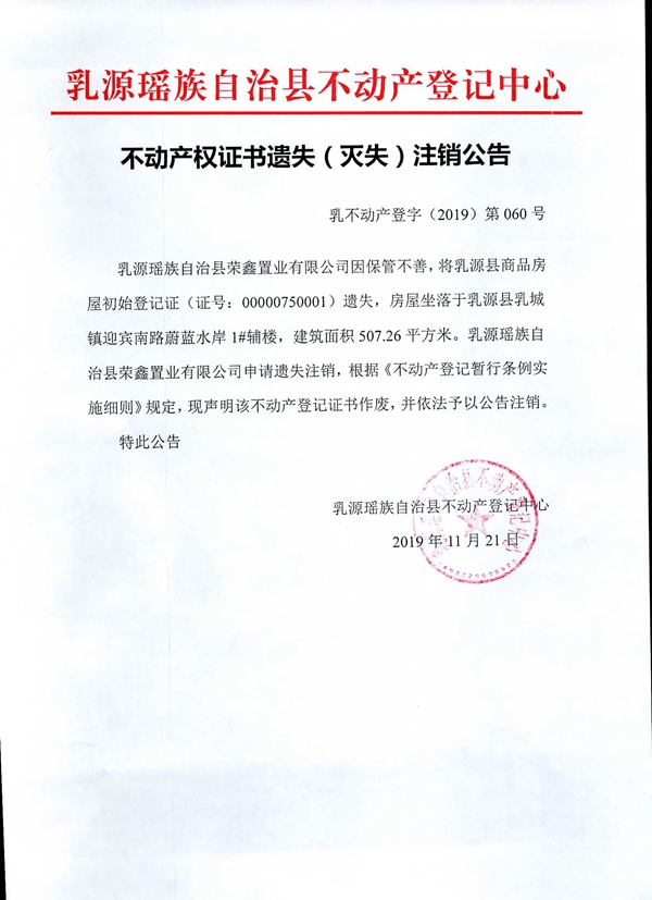 不动产权证书遗失(灭失)注销公告