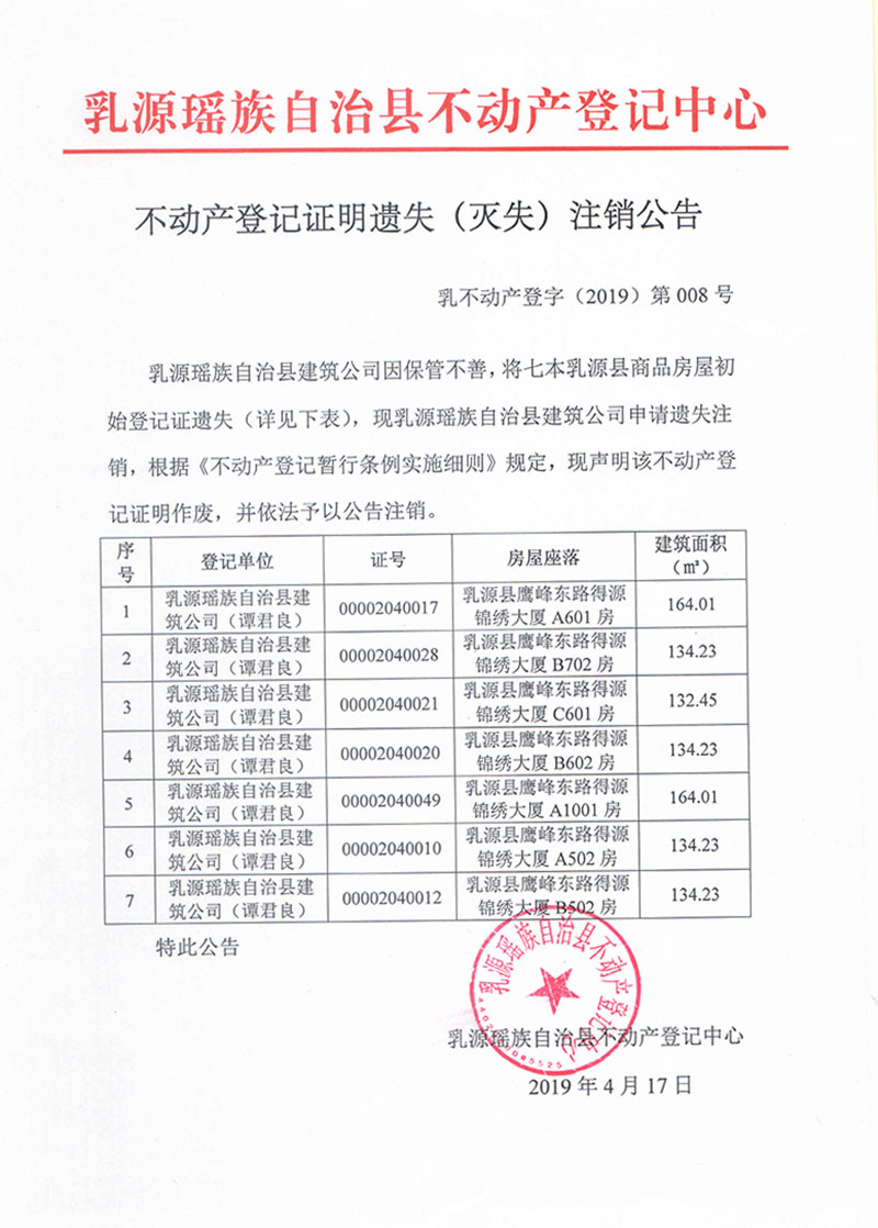 不动产登记证明遗失(灭失)注销公告(乳源瑶族自治县建筑公司)