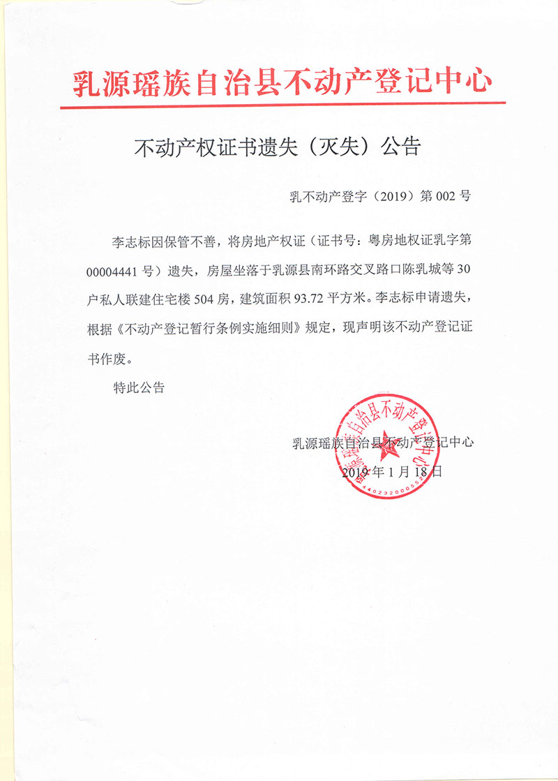 不动产权证书遗失(灭失)公告(李志标)