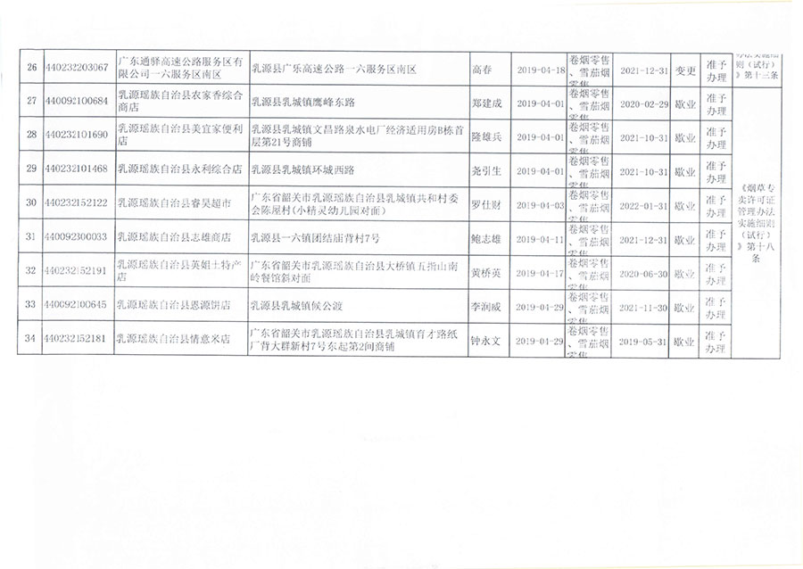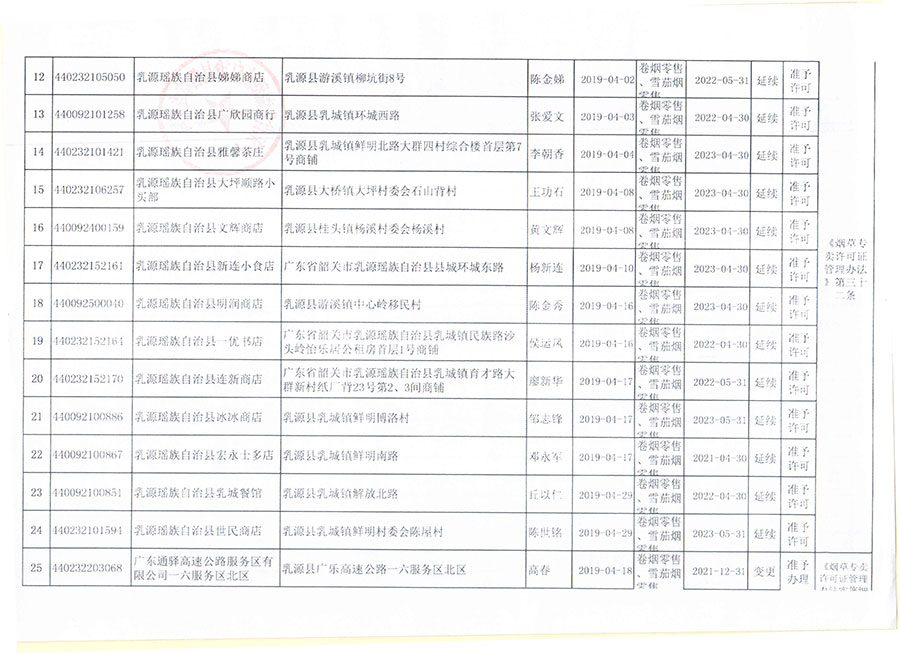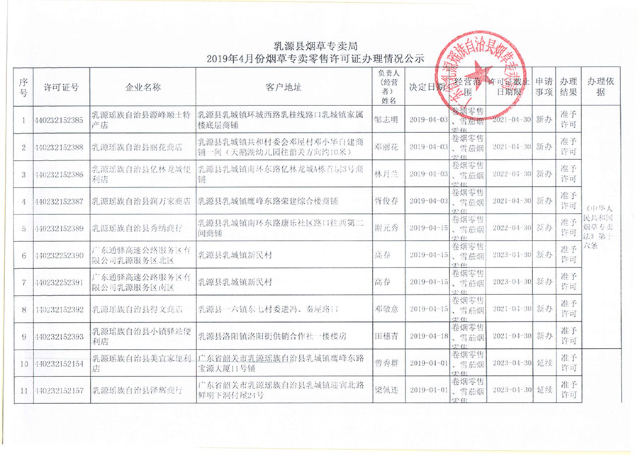 乳源县烟草专卖局2019年4月份烟草专卖零售许可证办理情况公示