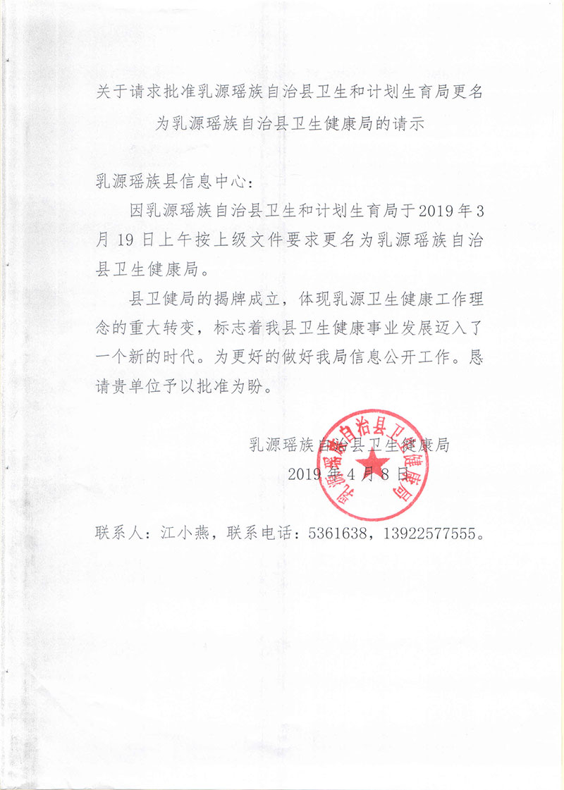 关于请求批准乳源瑶族自治县卫生和计划生育局更名为乳源瑶族自治县卫生健康局的请示