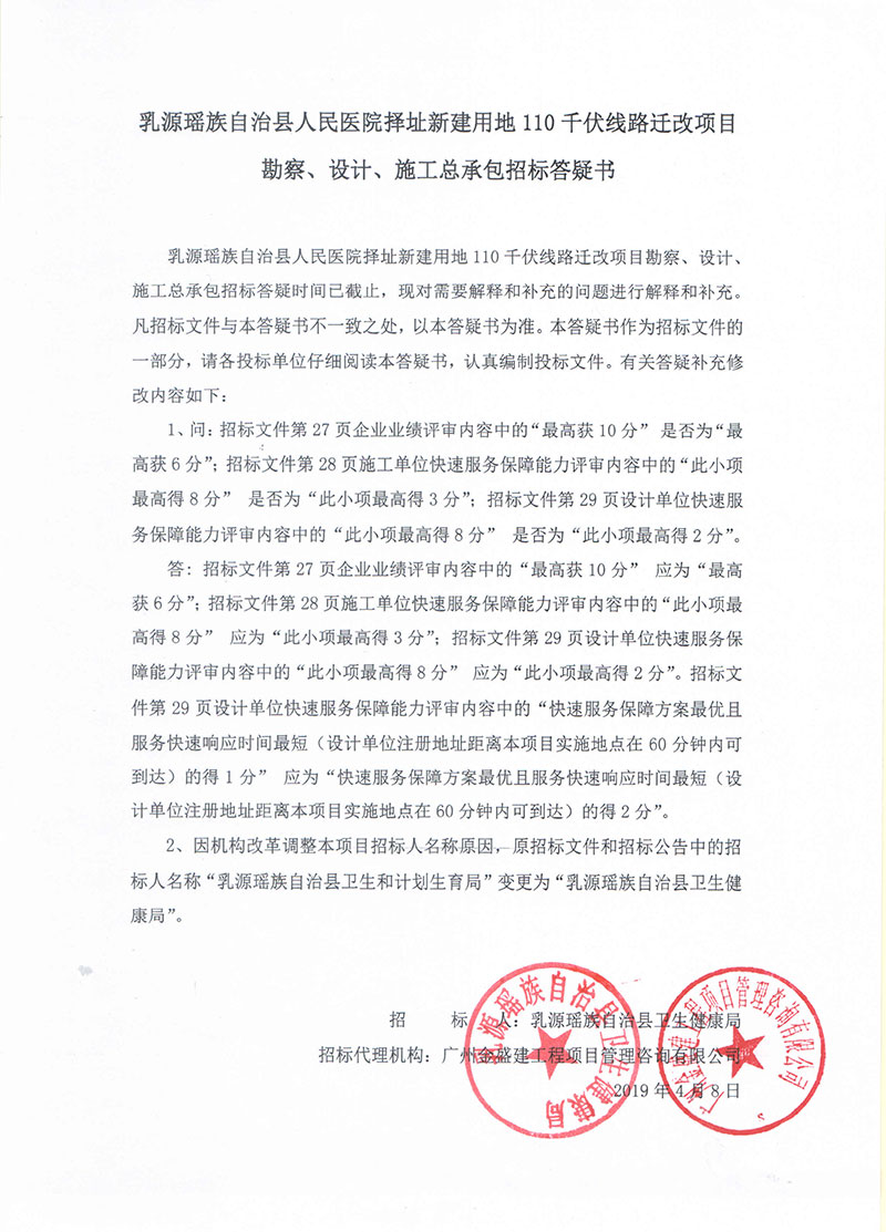 乳源瑶族自治县人民医院择址新建用地110千伏线路迁改项目勘察、设计、施工总承包招标答疑书