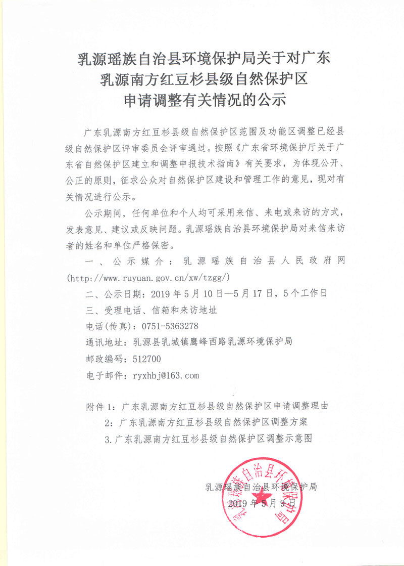 乳源瑶族自治县环境保护局关于对广东乳源南方红豆杉县级自然保护区申请调整有关情况的公示