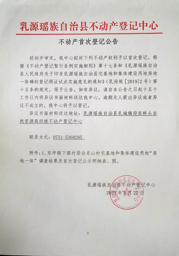 不动产首次登记公告(东坪镇下寨村委会房地一体登记).docx