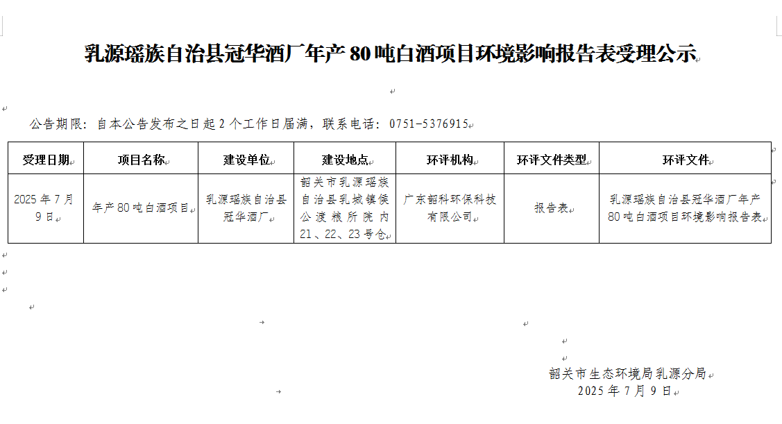 乳源瑶族自治县冠华酒厂年产80吨白酒项目环境影响报告表受理公示