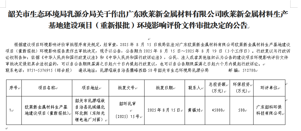 韶关市生态环境局乳源分局关于作出广东欧莱新金属材料有限公司欧莱新金属材料生产基地建设项目(重新报批)环境影响评价文件审批决定的公告