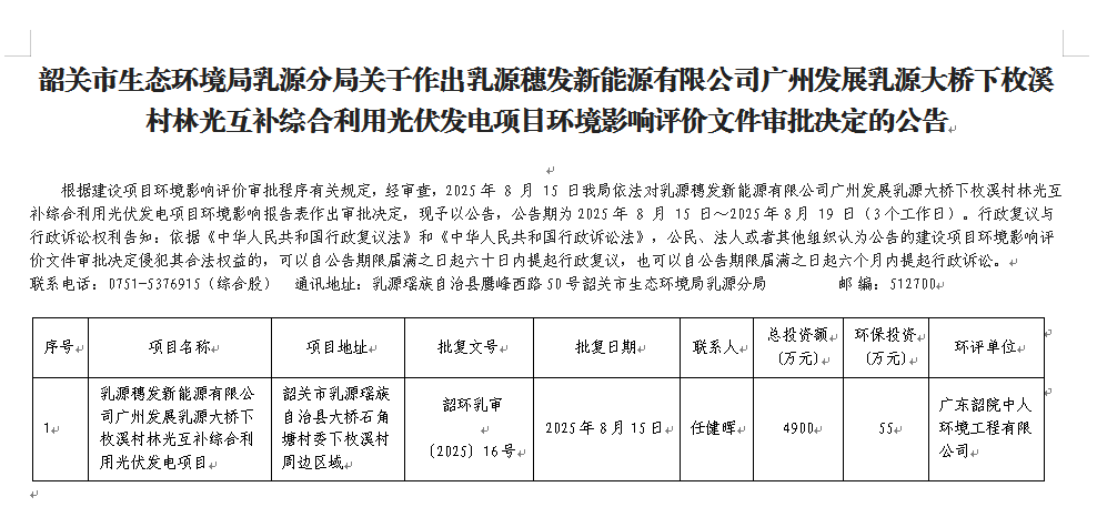 韶关市生态环境局乳源分局关于作出乳源穗发新能源有限公司广州发展乳源大桥下枚溪村林光互补综合利用光伏发电项目环境影响评价文件审批决定的公告