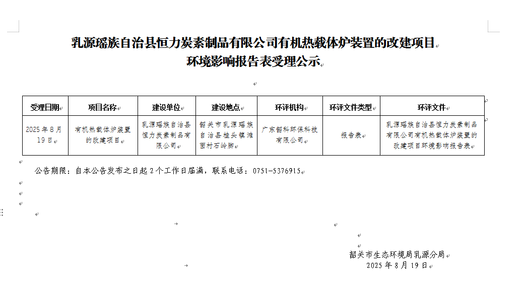 乳源瑶族自治县恒力炭素制品有限公司有机热载体炉装置的改建项目