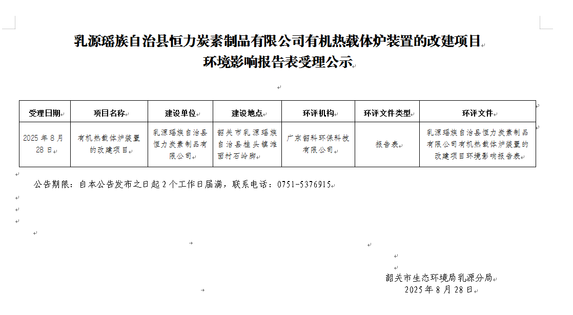 乳源瑶族自治县恒力炭素制品有限公司有机热载体炉装置的改建项目环境影响报告表受理公示(以此份为准)