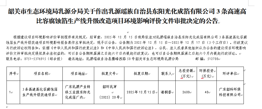 韶关市生态环境局乳源分局关于作出乳源瑶族自治县东阳光化成箔有限公司3条高速高比容腐蚀箔生产线升级改造项目环境影响评价文件审批决定的公告