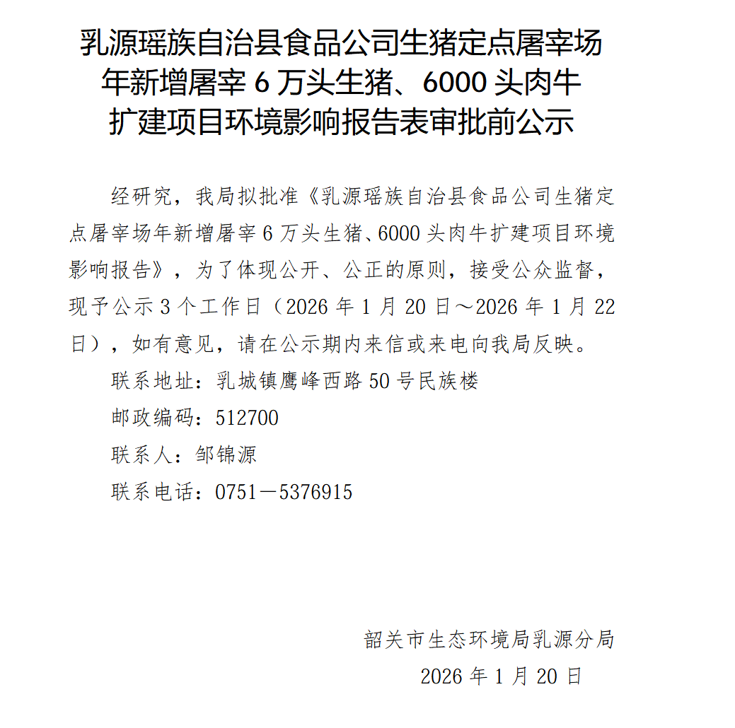 乳源瑶族自治县食品公司生猪定点屠宰场年新增屠宰6万头生猪、6000头肉牛扩建项目环境影响报告表审批前公示