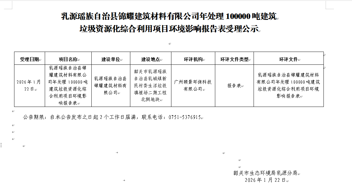 乳源瑶族自治县锦耀建筑材料有限公司年处理100000吨建筑垃圾资源化综合利用项目环境影响报告表受理公示