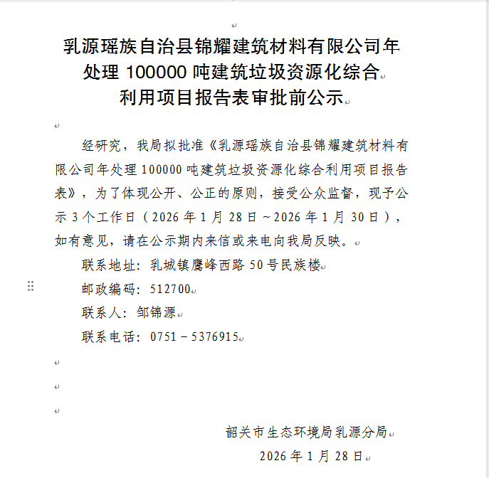 乳源瑶族自治县锦耀建筑材料有限公司年处理100000吨建筑垃圾资源化综合利用项目报告表审批前公示