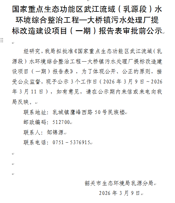 国家重点生态功能区武江流域(乳源段)水环境综合整治工程—大桥镇污水处理厂提标改造建设项目(一期)报告表审批前公示