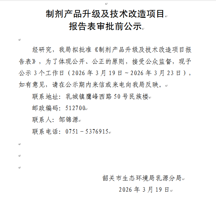 制剂产品升级及技术改造项目报告表审批前公示