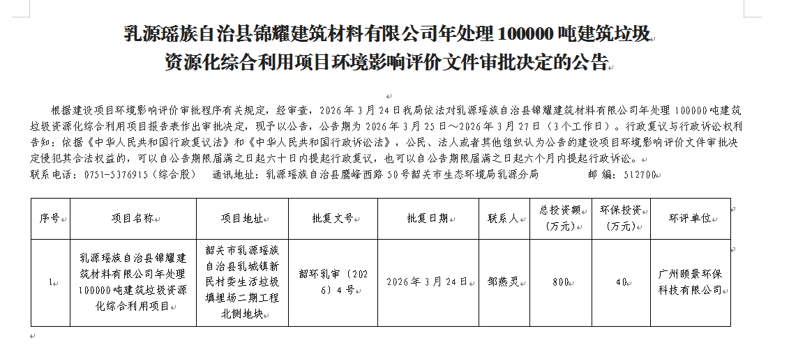 乳源瑶族自治县锦耀建筑材料有限公司年处理100000吨建筑垃圾资源化综合利用项目环境影响评价文件审批决定的公告