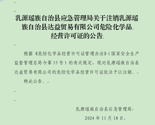 乳源瑶族自治县应急管理局关于注销乳源瑶族自治县达益贸易有限公司危险化学品经营许可证的公告