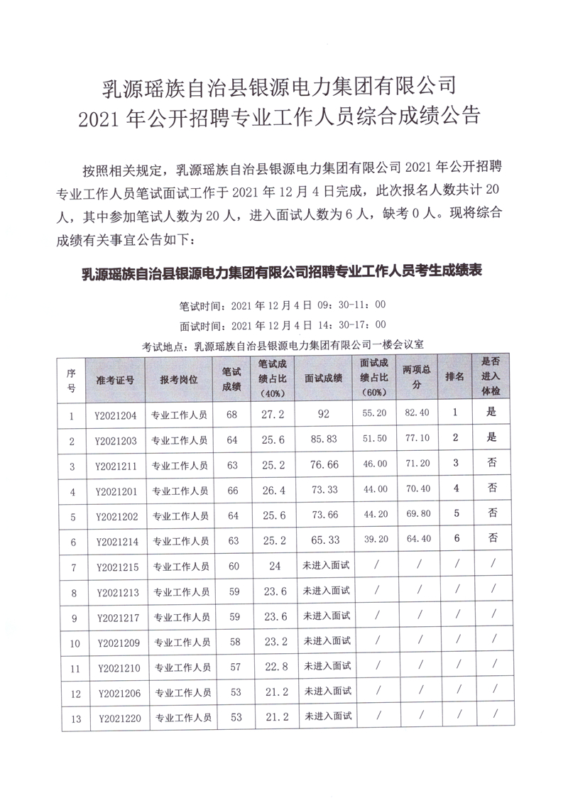 乳源瑶族自治县银源电力集团有限公司2021年公开招聘专业工作人员综合成绩公告