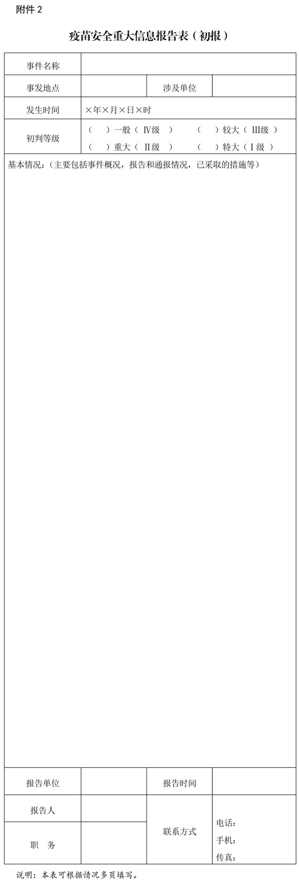 向国家药品监督管理局报告疫苗安全事件信息的,以《疫苗安全重大信息报告表》(附件2、3)形式报送,分为初报和续报。初报后,根据事件发展和应急处置等情况,及时续报。初报内容包括事件发生时间、地点、当前状况、危害程度、先期处置、发展趋势等。续报内容包括事件进展、后续应对措施、调查详情、原因分析等。