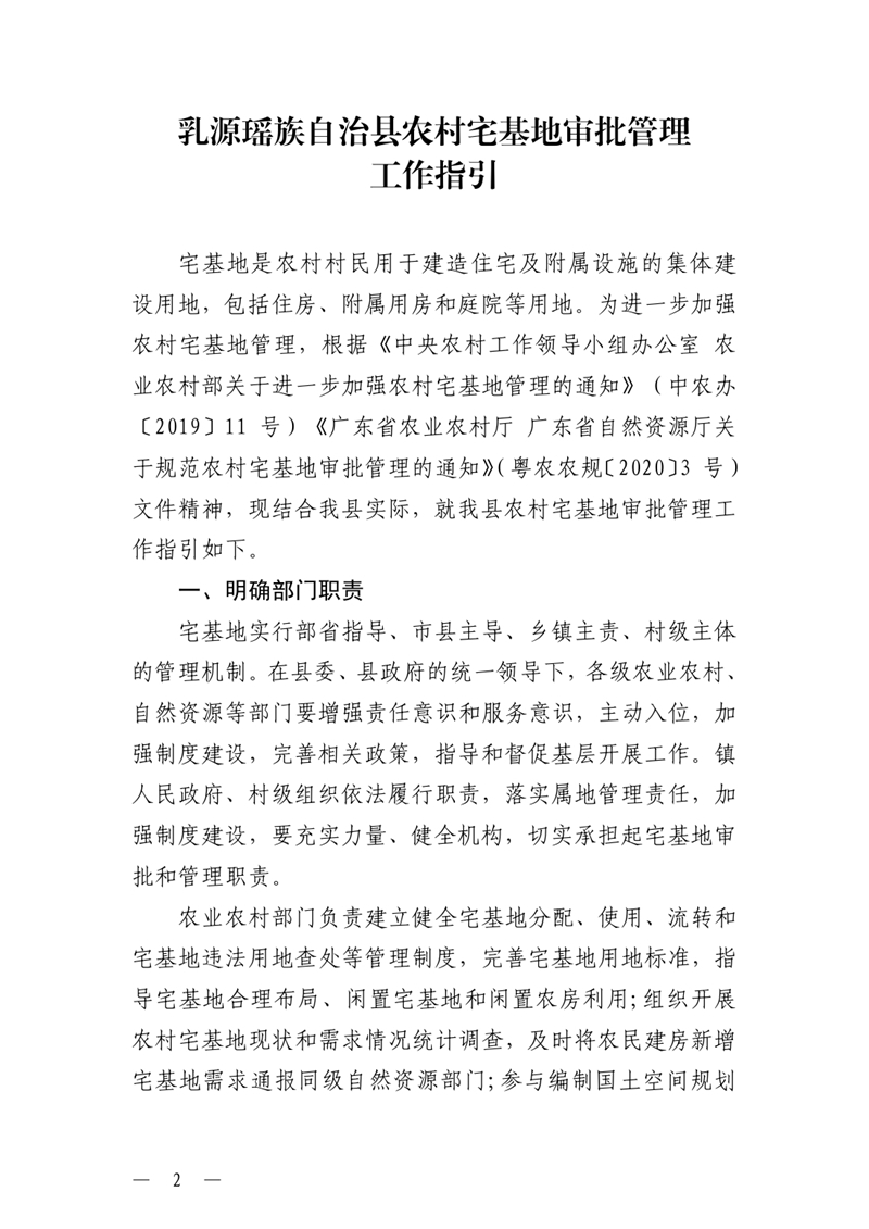 乳源瑶族自治县人民政府关于印发《乳源瑶族自治县农村宅基地审批管理工作指引》的通知(乳府规〔2020)3号)